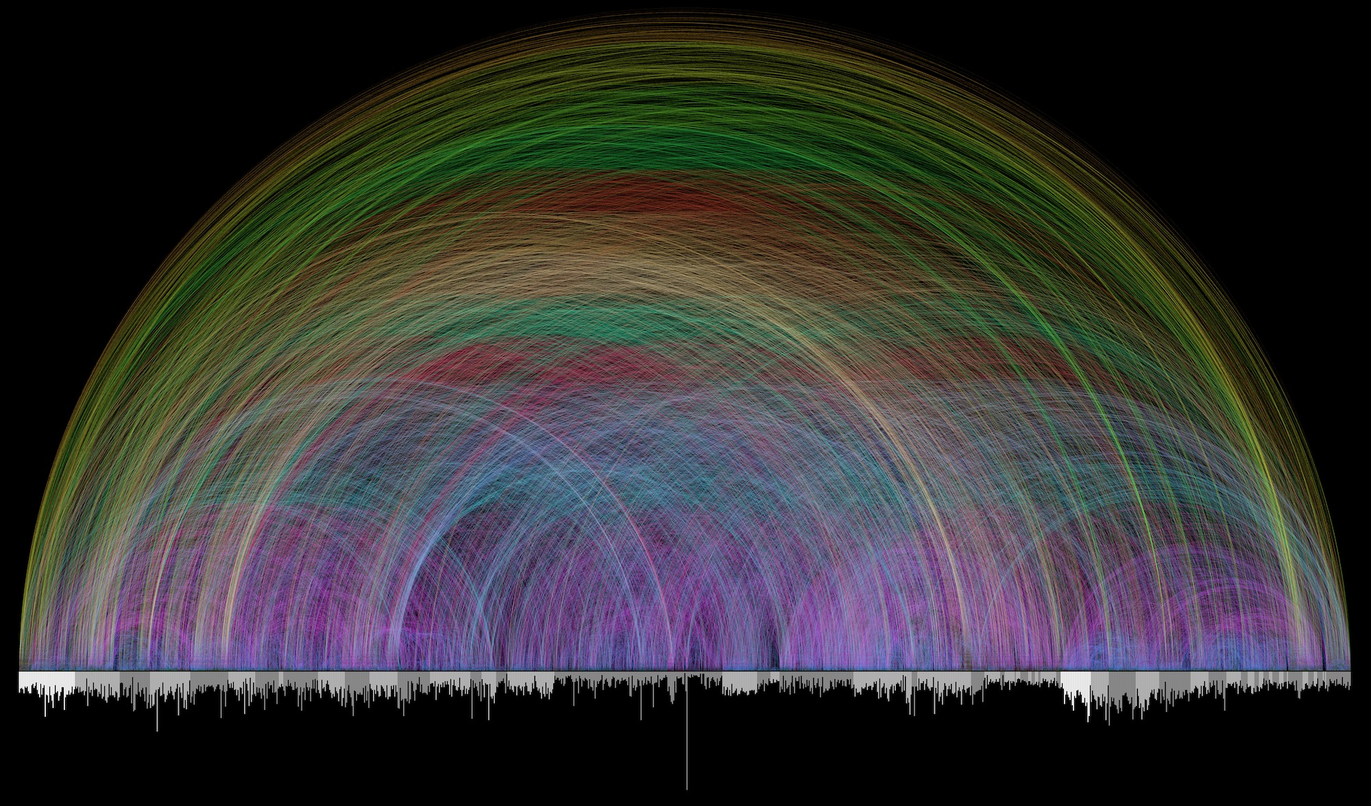 Bilden är en visualisering av 63,779 parallellhänvisningar i Bibeln. De vita strecken på bilden representerar varje kapitel från 1 Mosebok 1 till Uppenbarelseboken 22. Varje ”hyperlänk” visas genom en linje som kopplar med respektive kapitel. Linjerna är färglagda baserat på deras avstånd mellan varandra. Så mycket komplex diversitet och ändå så mycket harmoni. Ett budskap för alla tider. Grafiken är gjord av Chris Harrison – https://www.chrisharrison.net/ind…/Visualizations/BibleViz